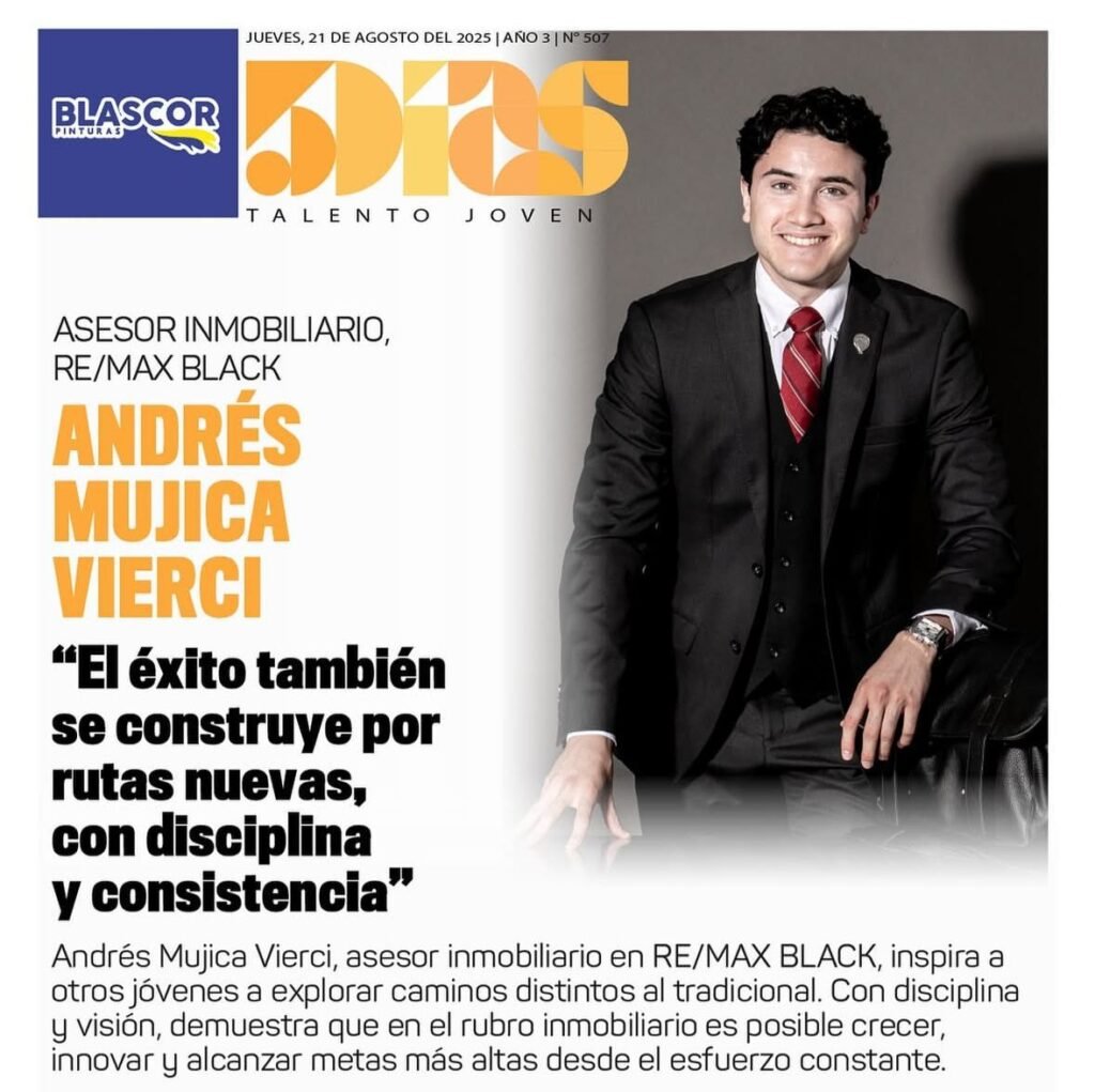 Nuestro agente Andrés Mujica Vierci fue destacado en la revista 5 Días – Talento Joven, donde compartió su visión sobre cómo el éxito se construye con disciplina, consistencia e innovación.